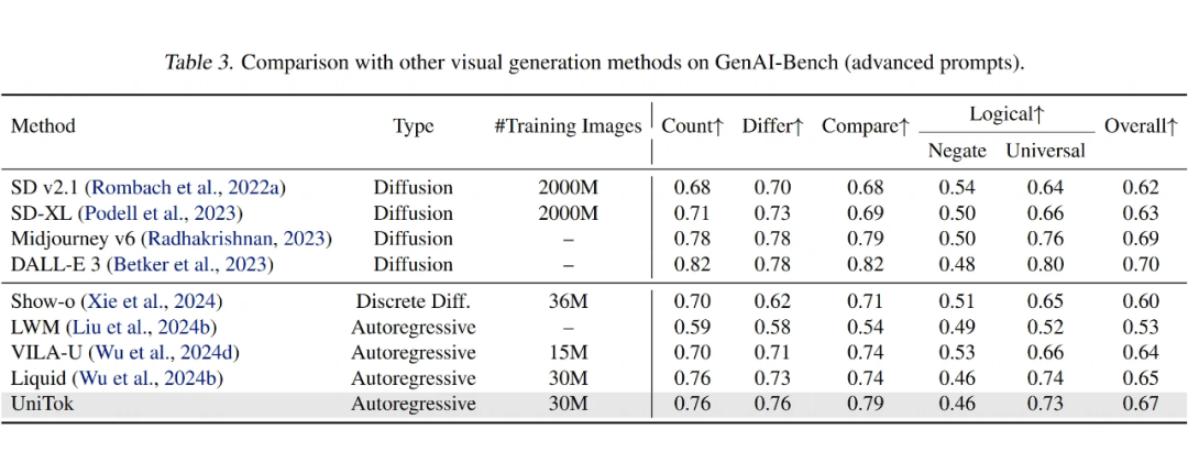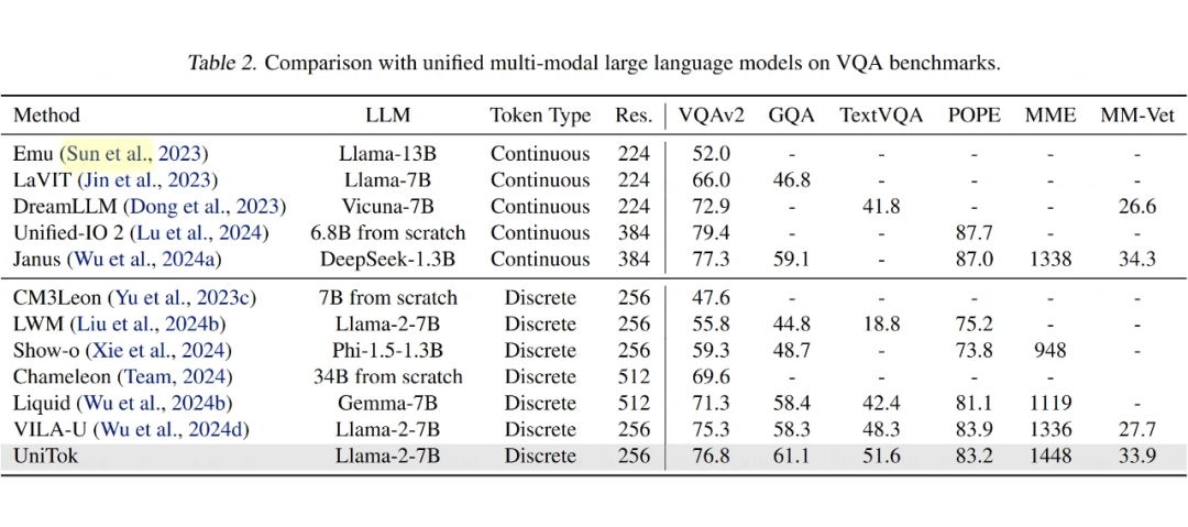 UniTok 在多个视觉问答(VQA)基准测试中,明显优于其他统一模型,如 Chameleon 和 VILA-U,在准确率和其他评分上都取得了更好的成绩。它缩小了与使用连续视觉标记器的模型之间的性能差距。