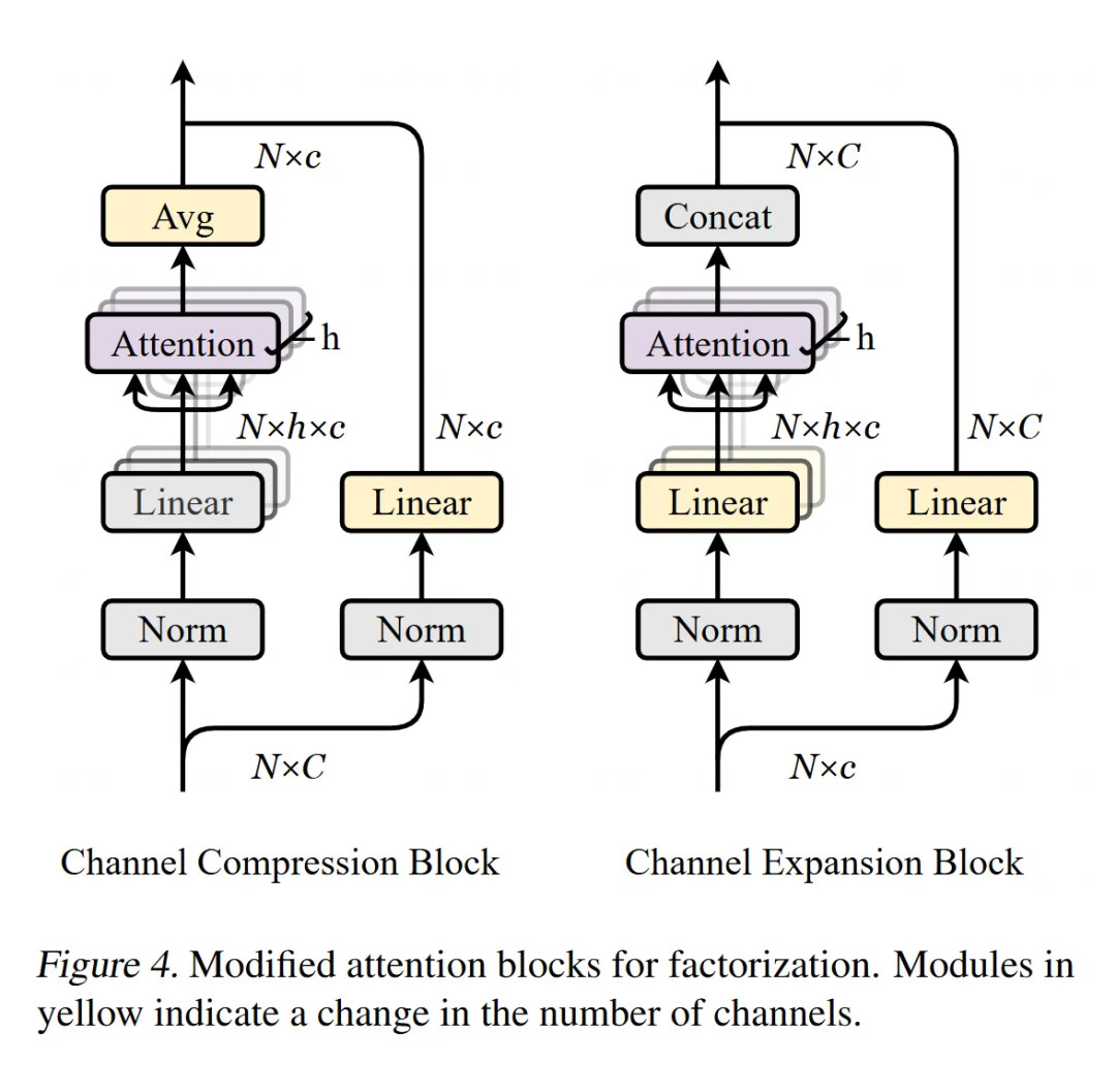 改进:研究人员建议使用多头注意力(Multi-Head Attention)模块来替代简单的线性层进行分解(具体结构见图 4,包含一个通道压缩块和一个通道扩展块)。