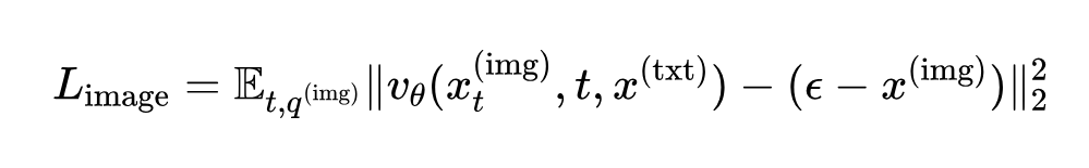 图像分支:负责处理图像的“词汇”(token),输出的是一个速度场,也就是告诉模型如何从带噪声的图像一步步恢复出清晰的图片。这个速度场的预测是基于文本条件的,记作: