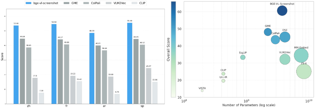 BGE-VL-Screenshot 在 4 项任务中表现出色,以 60.61 的综合得分达到 SOTA。在此基础上,通过少量 query2screenshot 多语言数据训练,模型实现了在英文之外的多语言任务上的出色表现。