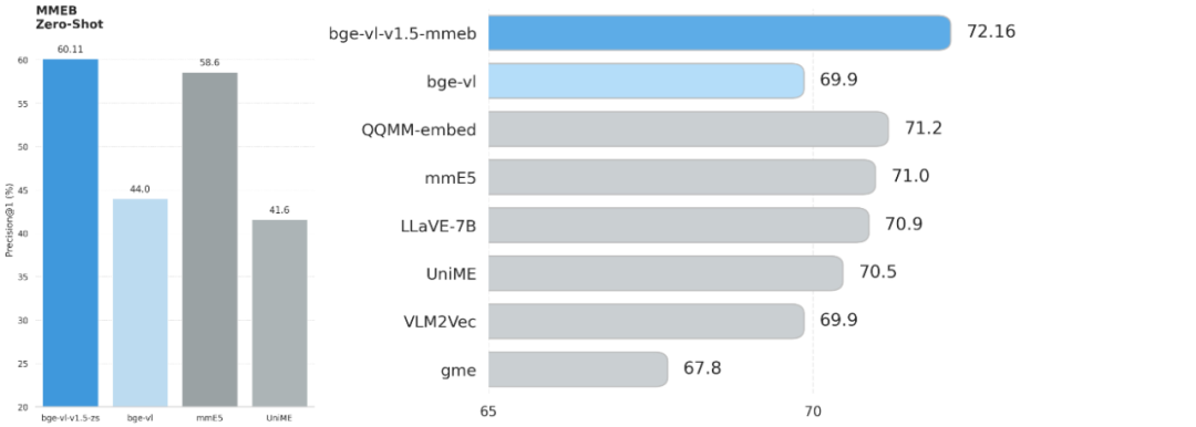 左为 BGE-VL-v1.5-zs 和其他 zero-shot 模型在MMEB上的表现,右为 BGE-VL-v1.5-MMEB 在 MMEB 基准检索任务上的表现