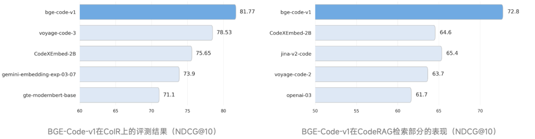 CoIR 代码检索基准,收集了覆盖 14 种编程语言的 4 大类 8 个子任务,能够有效地评估模型在自然语言和代码的各类混合场景中的检索能力。CodeRAG-Bench 基准评估了代码检索模型在代码检索增强(RACG)中的表现。BGE-Code-v1 在两个基准上均以显著优势超越谷歌、Voyage AI、Salesforce、Jina 等商业 / 开源模型,登顶 SOTA。