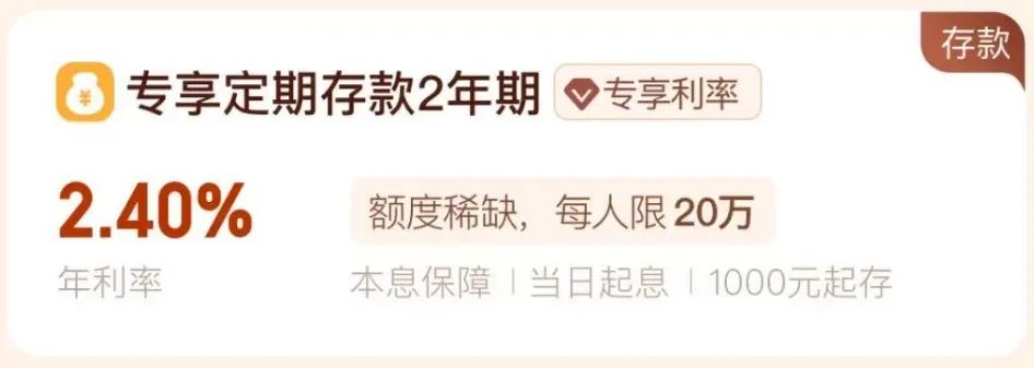 1年期2.0%的不限额,2年期2.4%的有20万定存上限: