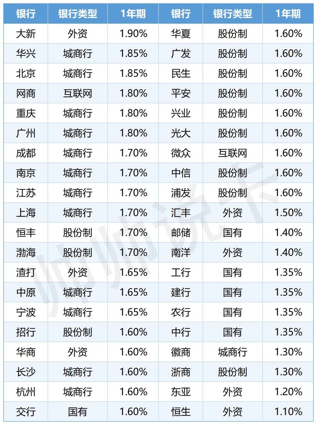 这里帅帅也整理了一下这个月几十家银行的1年期定存利率,最高的不过1.9%: