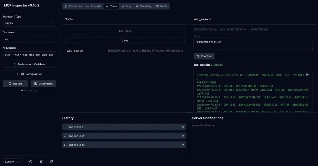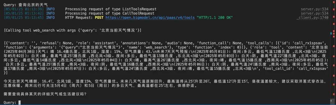 response = await session.call_tool(‘web_search’, {‘query’: ‘今天北京天气’})