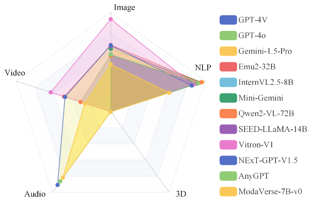 任务多元,场景丰富:测试集涵盖了 145 项多模态技能,29 个应用场景。既包括常见的“看图说话”图像描述、视觉问答等基础题,也有诸如“听声音画图”、“读文章配视频”等烧脑的跨模态挑战。领域上横跨物理、几何、医学、历史、艺术、人文学科等,让模型面对如同人类考试文理综合的难题。举例来说,可能出现一道物理题附带复杂图表,或一道历史题给出文物的 3D 模型让模型辨析。如此广泛的覆盖,旨在测试模型是否具备跨学科、跨模态的知识整合能力。