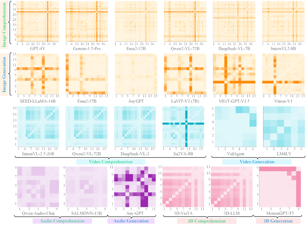 多模态模型整体弱项:General-Bench 的统计还发现,所有模型在音频类任务上的平均得分不足 30/100,几乎集体不及格。在需要解析语音、音乐的题目上,不论是大名鼎鼎的 GPT-4V 还是其他模型,表现都不理想。这反映出当前视觉-语言模型对声音的理解和生成还非常初级。更夸张的是,在 3D 相关任务上所有模型几乎全军覆没,最好的正确率仅有 6.7%!可见,处理三维模型、点云这样的高级感知任务,对现有 AI 仍是巨大挑战。