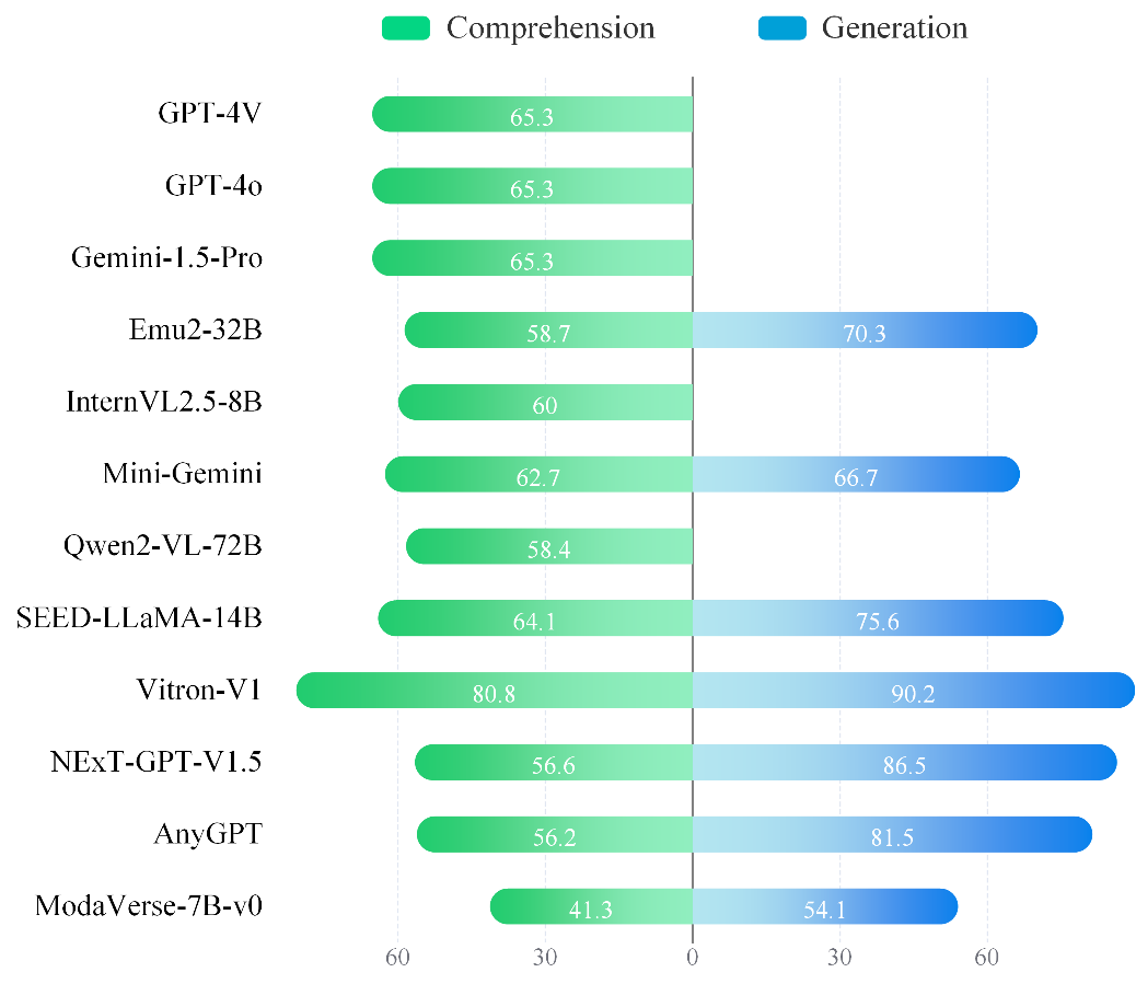 当如此严苛的 General-Bench 试卷摆在当前顶尖模型面前,会是怎样的光景?论文对 100 多个先进的多模态模型在 700 多个跨模态任务上进行了测试(测试时间是 24 年底之前的多模态大模型,跟当前最新的一些版本模型稍有时间上的延迟),结果可以说是几家欢喜几家愁,更让人大跌眼镜。一些业界公认强大的模型在这场通才大考中显露出意想不到的短板。下面我们揭晓部分关键结果: