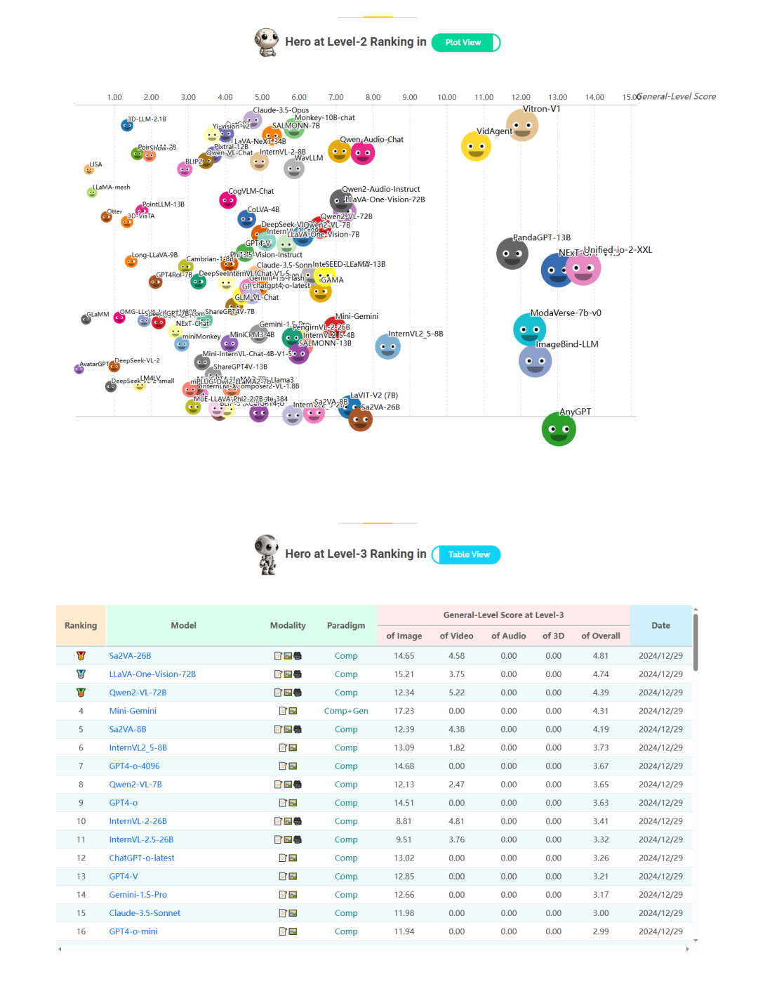 Level-5(王者级):“全模态互促的通才”。这是评估体系的顶点,代表真正实现了跨模态的全面协同。王者级模型不仅在视觉、听觉、文本的理解和生成各方面均衡强大,更实现了语言和非语言模态之间的相互赋能。换言之,模型具备高度的“通感”能力:语言智能可以加强视觉/听觉智能,反之视觉、听觉等多模态的感知也能反馈提升语言理解与表达。这就如同人类看到一幅画作能激发灵感写诗,反过来诗歌修养又丰富了对画作的解读。这种全模态协同效应(Cross-modal Total Synergy)是通才智能的终极标志。在评价上,如果模型在纯语言的 NLP 任务上也能超过单模态语言模型的 SOTA,并将这种能力融入多模态任务中,即可视为出现了完全协同。然而正如榜单所示,截至目前尚无模型达到王者段位,我们还在等待“多模态版的 ChatGPT 时刻”。