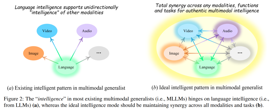 在踏上“通才”之路前,团队首先剖析了当前绝大部分的多模态大模型(无论是多模态基础模型还是多模态智能体)存在的瓶颈。论文一针见血地指出:现有的大部分的多模态模型基本是基于“语言智能 LLM”所二次构建的“间接式多模态智能”,类似于用胶水拼接起来的“缝合怪”。虽然它们可以同时处理图像、文本、视频等等多种模态,但本质上往往是不同模块的堆叠+二次微调:比如用预训练视觉编码器接上语言模型,让模型“看图说话”。这种架构上的松耦合导致模型更像多个专才的拼盘,而非一个真正融会贯通的通才。这样的“多模态 Frankenstein”只是在语言智能的基础上外挂视觉、听觉接口,其多模态推理过程很大程度上仍依赖底层的大语言模型对文本的强大记忆和关联能力。模型缺乏各模态间的深度协同,更谈不上原生多模态智能,实现在跨模态/任务之间举一反三。