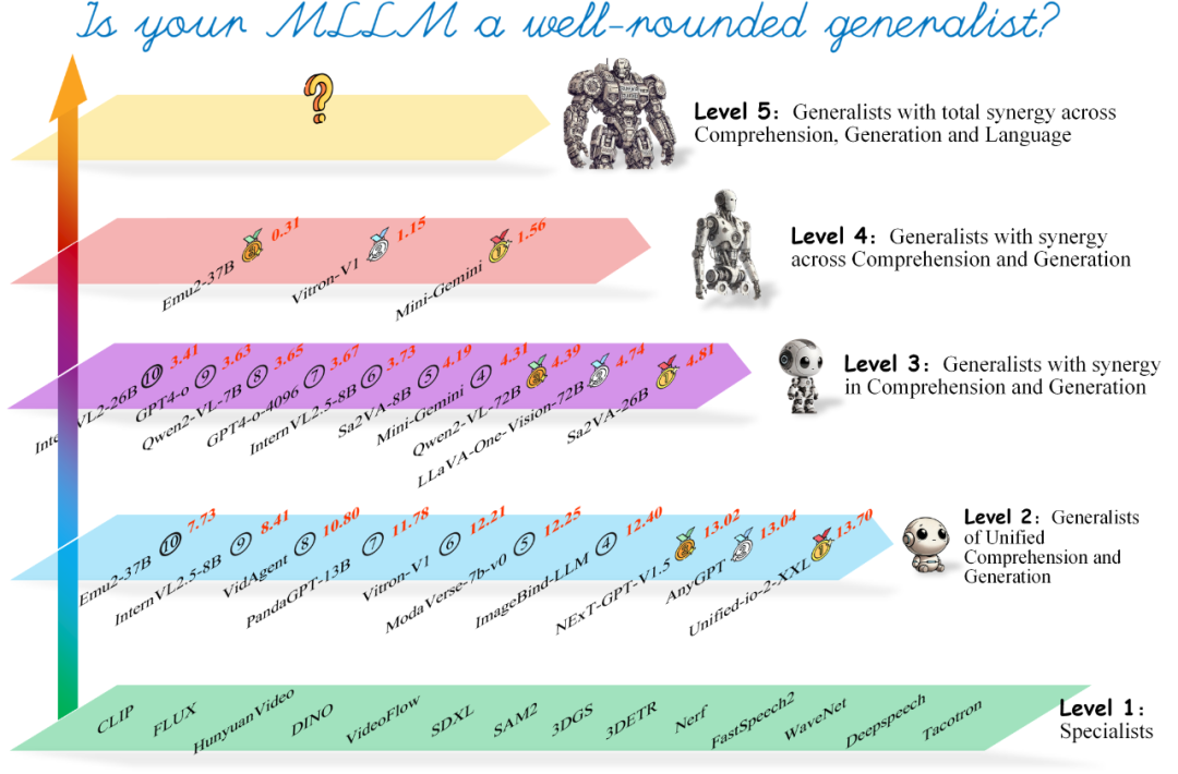 综上,当前的多模态大模型更像多个专家的简单拼合,远未形成跨模态的融会贯通。针对这些短板,评估标准也必须升级,才能暴露模型的真实能力缺陷。General-Level 和 General-Bench 的提出,正是要回答“如何定义和衡量通才智能”这一问题,为 AI 下半场奠定新的竞赛规程。