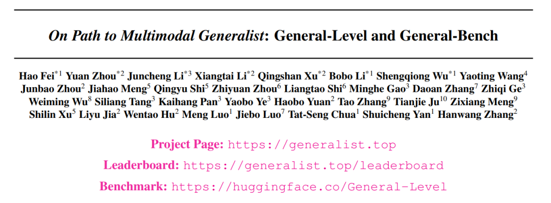 这样的理念正在获得实践的支撑。近期,一支来自新加坡国立大学(NUS)和南洋理工大学(NTU)等机构领衔的团队的研究,围绕了通用多模态模型的评估而非训练展开。这篇题为《On Path to Multimodal Generalist: General-Level and General-Bench》的论文提出了全新的“通才智能”评测框架,旨在为多模态大模型(Multimodal Large Language Model, MLLM)的能力设立一把更合适的标尺。该团队强调,只有转变思路,把精力投向评测体系的革新,我们才能真正衡量 AI 是否在朝着通用智能(AGI)的目标迈进。正如姚顺雨所言,下半场 AI 的胜负手在于评测标准的制定,而非一味堆砌训练技巧。这项超过 300 页的研究由超过 30 位研究者共同完成,核心作者团队来自新加坡国立大学、南洋理工大学,联合了浙江大学、北京大兴、罗切斯特大学等多家机构的学者,这支跨学科、跨地域的多元团队集合了计算机视觉、多模态、NLP 等领域的专家。该工作录用于国际机器学习大会 ICML 2025(Spotlight 论文),在众多投稿中脱颖而出,获得评审高度评价。该工作将期待为未来的通用多模态大模型的发展指明一条明道。