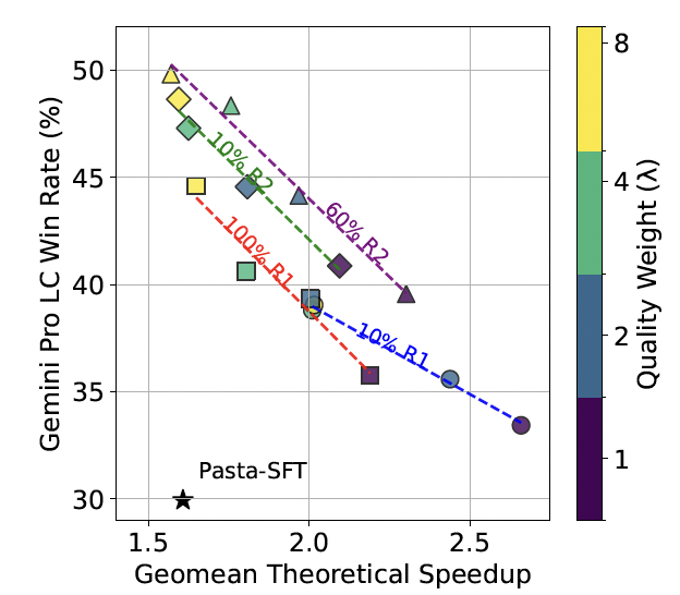 可扩展性。研究结果展示了 PASTA 方法出色的可扩展性,如图所示。随着偏好优化不断推进,PASTA 模型的性能持续提升。图中清晰展示了从第一轮开始到第一轮结束,再到第二轮开始和第二轮后半程的整个优化过程,质量-速度的 Pareto 前沿大体持续向右上方推进。