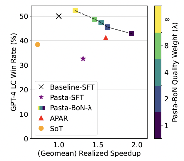 质量-速度平衡的 Pareto 前沿。如图所示,PASTA 通过调节质量权重参数生成了一系列的模型。在不同的生成质量的情况下,PASTA 均能提供非常可观的加速。结果显示,即使最注重质量的 PASTA 模型也能提供显著加速,而最快的模型则以一定的质量牺牲换取接近 2 倍的速度提升。与基于手动设计的异步生成方案(Skeleton-of-Thought, APAR)相比,PASTA 模型展现出全面优势。