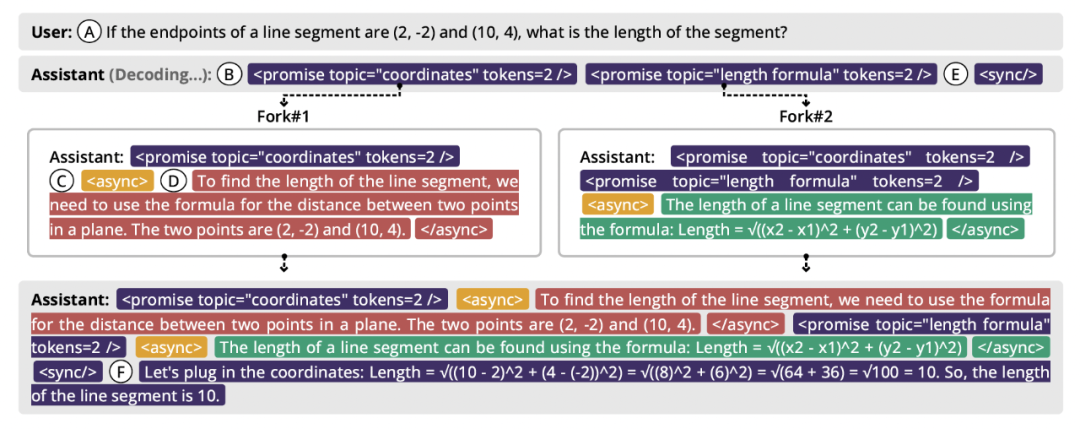 <promise/> 标记(B),随后用 <sync/> 标记(E)表明需要等待这些内容完成。图中红色和绿色区域(C、D)显示了两个异步线程并行生成的内容,最终在(F)处组合成完整解答。