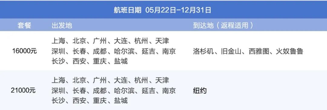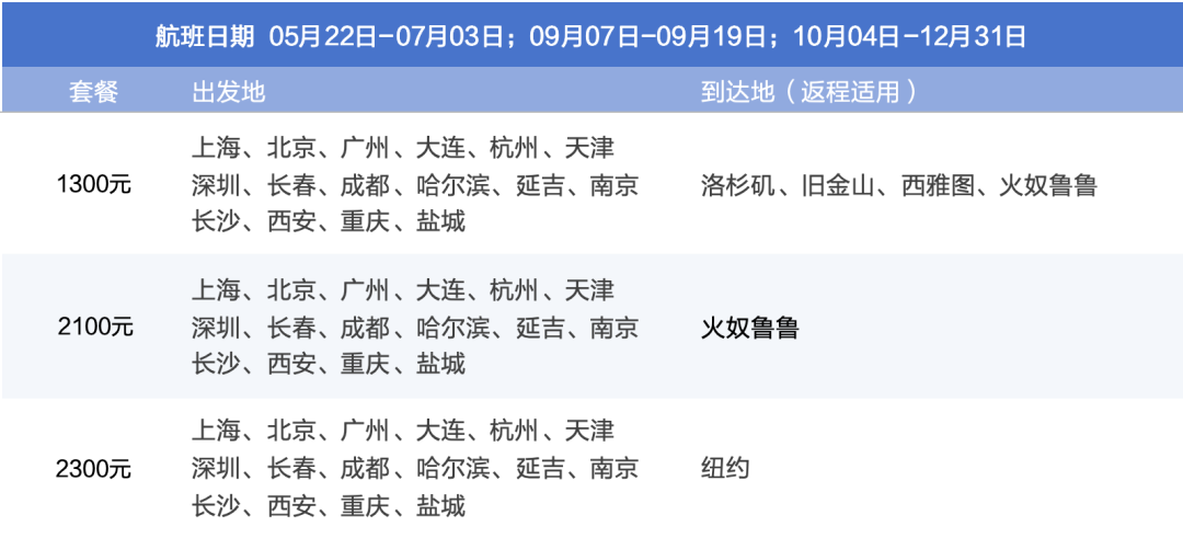 航班日期:5月22-7月3;9月7-9月19;10月4-12月31飞洛杉矶/旧金山/西雅图/夏威夷 16000元