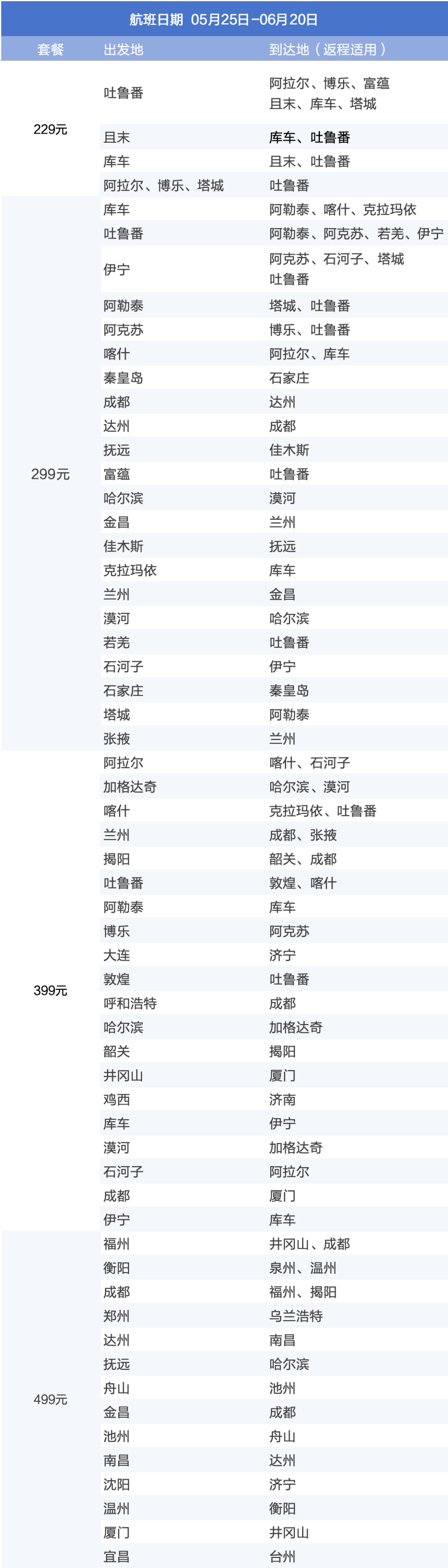 229元套餐主打新疆区内航线,连接吐鲁番、阿拉尔、库车等热门城市,适合本地短途出行。