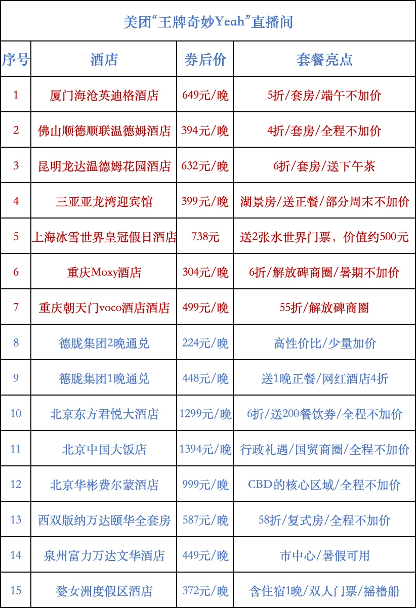今天直播间特别推荐的酒店请见下表: