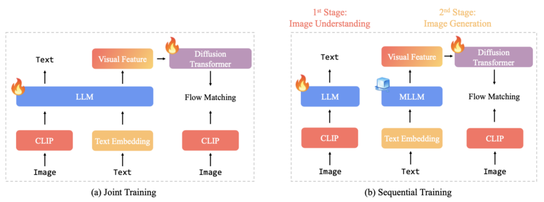 caption:联合训练(early fusion)同时更新理解和生成模块,顺序训练 (late fusion)先独立调优「理解」,再冻结骨干只训练「生成」。