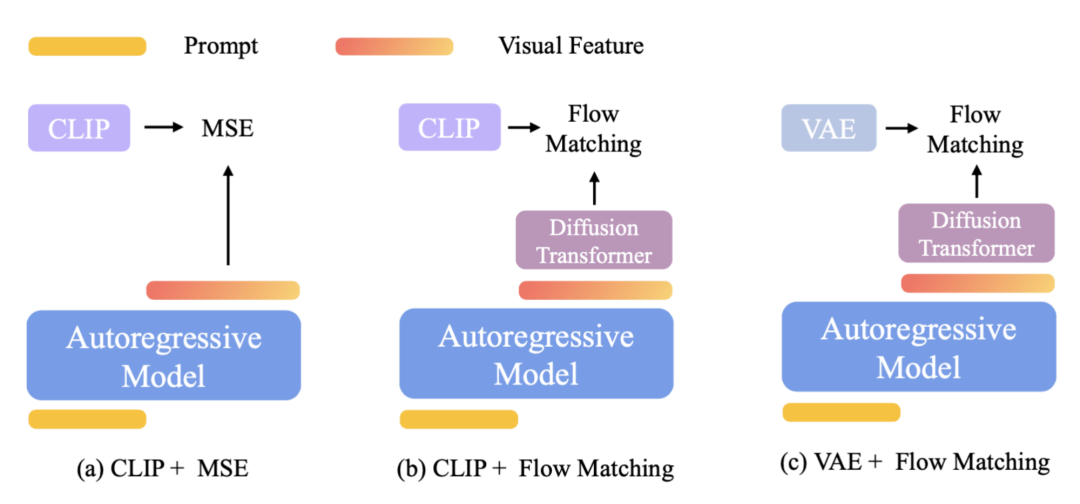 Flow Matching:基于自回归模型生成的预测特征,通过流匹配损失训练一个 Diffusion Transformer,用 Diffusion Transformer 的输出值来逼近 CLIP 或 VAE 特征