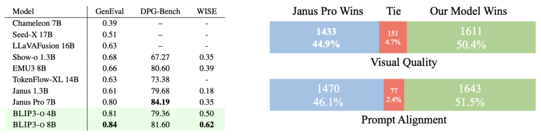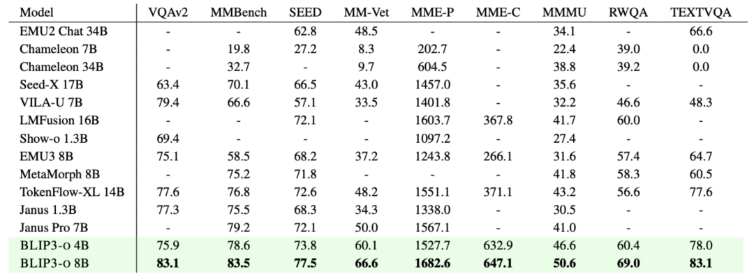 基于上述对比,研究者选定 CLIP + Flow Matching 与顺序训练 (late fusion),构建了 4B 和 8B 参数的 BLIP3-o: