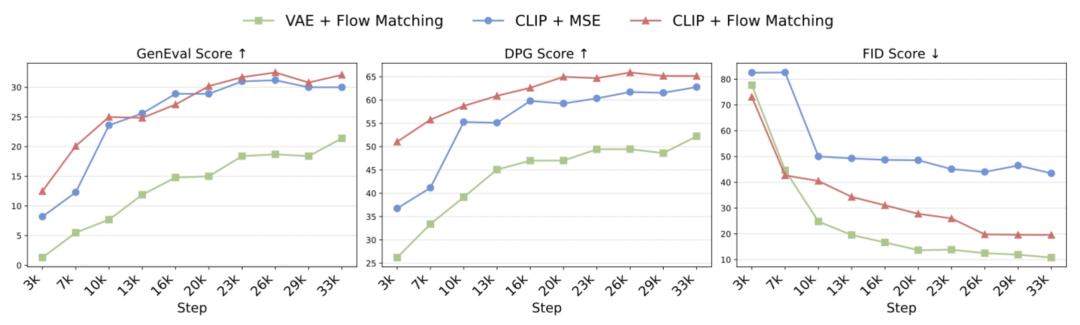本文首次系统地探索了结合自回归与扩散架构的统一多模态建模,评估了三个关键维度:图像表示(CLIP 特征 vs. VAE 特征)、训练目标(流匹配 vs. MSE)和训练策略(early fusion vs. 顺 late fusion)。实验结果表明,将 CLIP 嵌入与流匹配损失相结合,不仅加快了训练速度,也提升了生成质量。