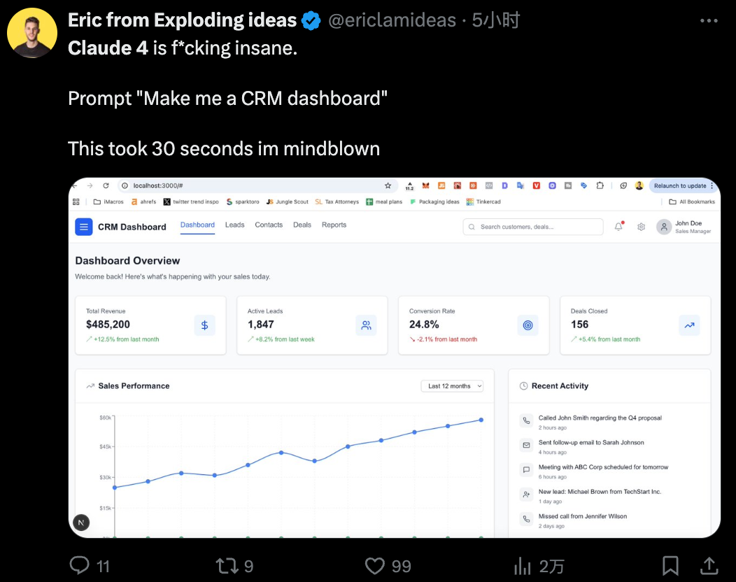 人们都在迫不及待地上手体验,有网友表示,Claude 4 只花了 30 秒,就做出了 CRM 的 dashboard。