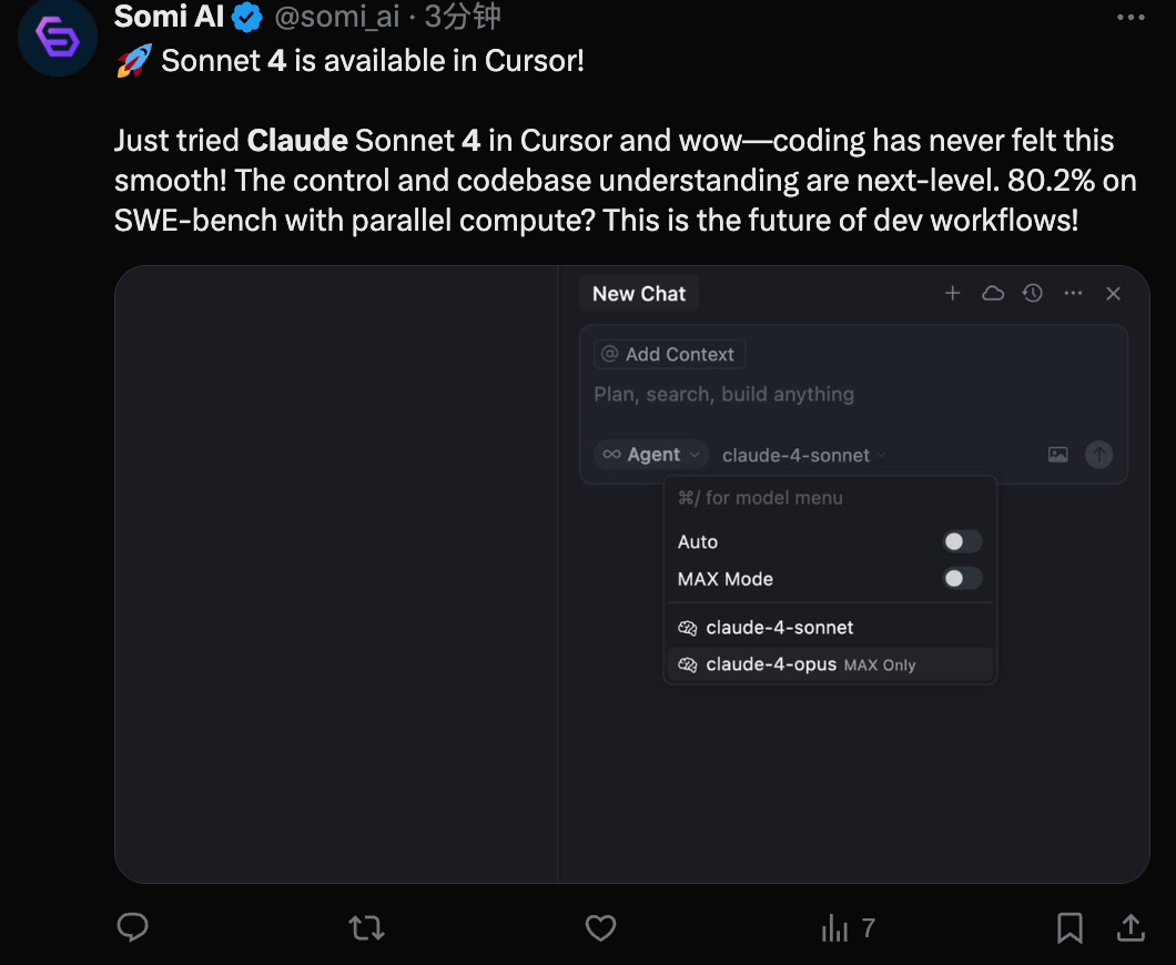 甚至有网友在 Cursor 已经用上了 Sonnet 4,并且表示编程从未如此丝滑过。