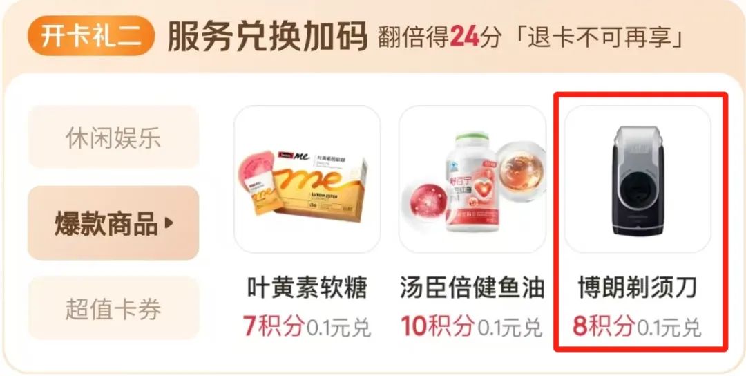 而且吧,618期间有限时玩法,积分甚至可以兑换博朗剃须刀(8点积分,需要等补库存):