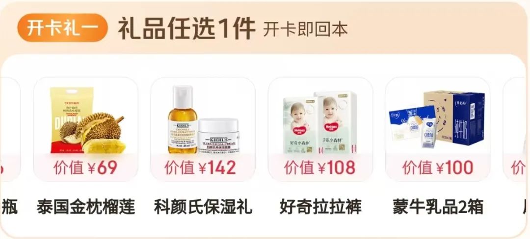 开卡礼1:礼品任选一件,包括红包以及实物礼品。红包金额是随机的,实物礼品包括:伊利乳品2箱、6箱鸡蛋年卡、大宇料理机、雅诗兰黛珍品、赫莲娜绿宝瓶、蒙牛乳品2箱等等: