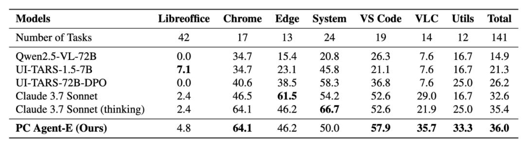 最终,团队在开源模型 Qwen2.5-VL-72B 的基础上进行训练,得到 PC Agent-E 智能体。作为一款原生智能体模型(native agent model),PC Agent-E 无需依赖复杂的工作流设计,即可实现端到端的任务执行。令人惊喜的是,在仅使用 312 条人工标注轨迹的情况下,模型性能便达到了训练前的 241%,展现出极高的样本效率。