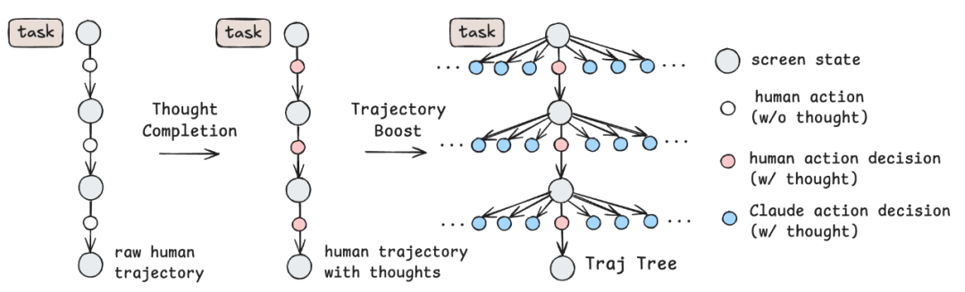 其核心观察为:每个电脑任务其实可以通过多种路径完成。也就是说,除了人类采取的动作以外,轨迹中的每一步其实都有多个「合理的动作决策」。为了捕捉这种轨迹内在的多样性,团队利用前沿模型 Claude 3.7 Sonnet,为轨迹的每一步合成更多的动作决策。团队注意到,轨迹中每一步记录的数据,作为「环境快照(environment snapshot)」,已足以为人类或智能体提供决策信息。于是,团队将这些快照提供给 Claude 3.7 Sonnet,采样多个包含思考过程的动作决策。这一过程极大丰富了轨迹数据的多样性。