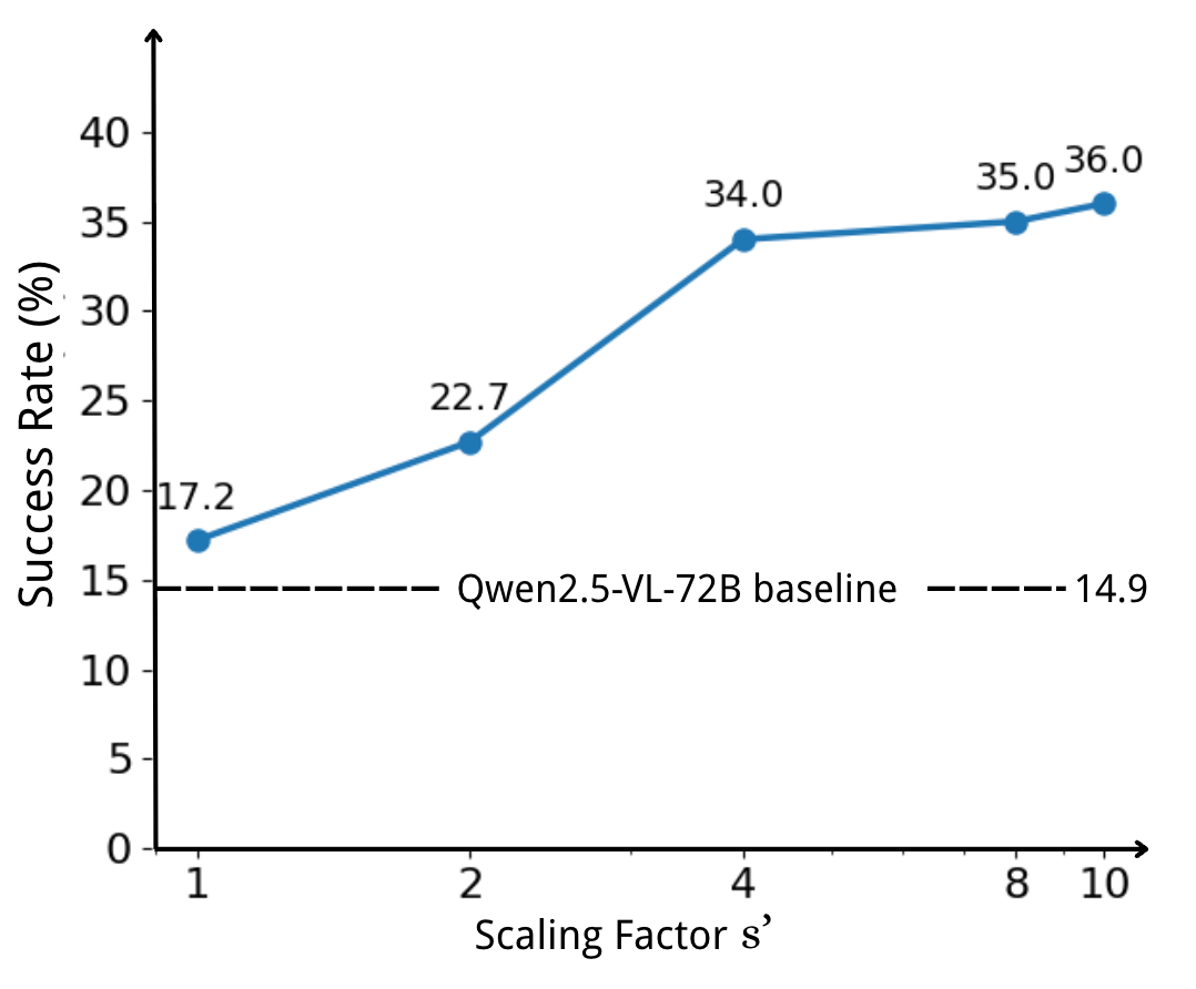 模型能力随训练数据中动作决策的扩展倍数的变化