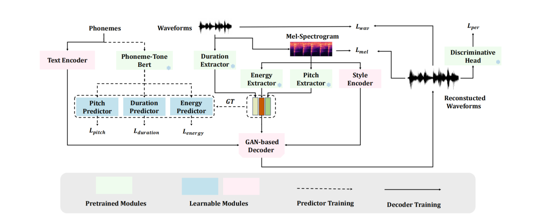 最后以 GAN 解码器直接从音素与预测特征合成波形,联合时域、频域与感知损失实现高保真、低延迟合成。