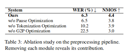 预处理链路有效性:消融实验表明,停顿预测、分词优化和 G2P 优化缺一不可;当分别移除这三项时,系统的 WER 从 6.3% 依次升至 6.5%、10.2% 与 22.5%,自然度评分 NMOS 从 4.4 下降到 3.8、3.9 与 3.0,尤其 G2P 的影响最大,证明精确声调与音素映射是泰语 TTS 的质量瓶颈。