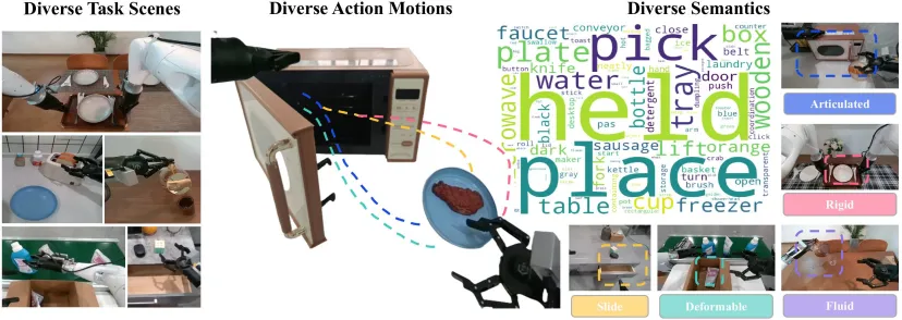 机器人动作与像素的高精度对齐:将机械臂 6D 位姿(x,y,z,roll,pitch,yaw)与末端执行器行程投影为 action map,确保物理动作与图像帧的像素级对齐,精准建模 “抓取”、“放置”、“碰撞”、“推拉”、“快速抛掷”、“缓慢摇晃” 等复杂动力学行为;