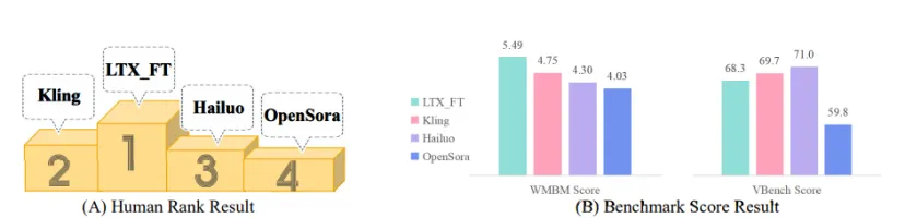 相较于当前主流视频生成评测基准 VBench,EWMBench 在评测结果与人类主观判断的一致性方面表现更优,能够更真实、细致地反映具身世界模型在交互理解、动作还原与视觉一致性等核心维度的实际能力。