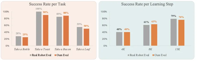 针对真机评测成本高、风险大、难以复现等痛点,EVAC 开创性地提出了生成式模拟评测方案,它能与待评测的策略模型进行交替推理,构建起一套完整的交互式评测管线。实验显示,在多个任务中,EVAC 所生成的评测结果与真机评测的成功率具有高度一致性,甚至能够可靠地识别出性能更优的模型权重,大幅提升了策略模型的筛选效率。