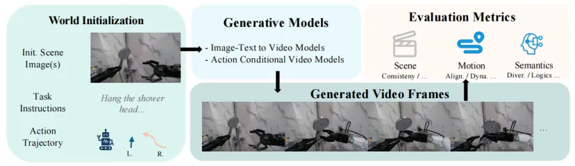 针对机器人操作场景的复杂性与特殊性,EWMBench 构建了立体化的评估体系,从场景一致性、动作合理性 与 语义对齐与多样性 三大核心指标进行分析: