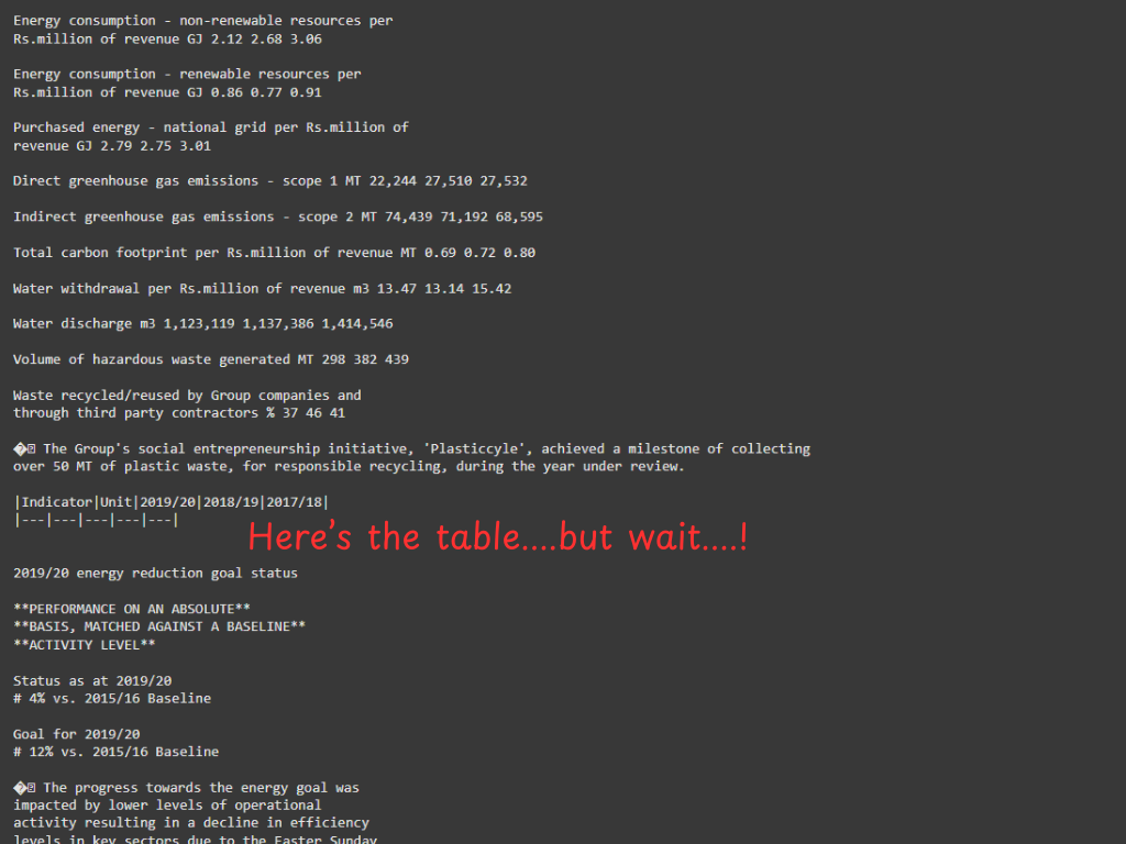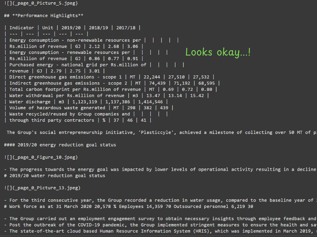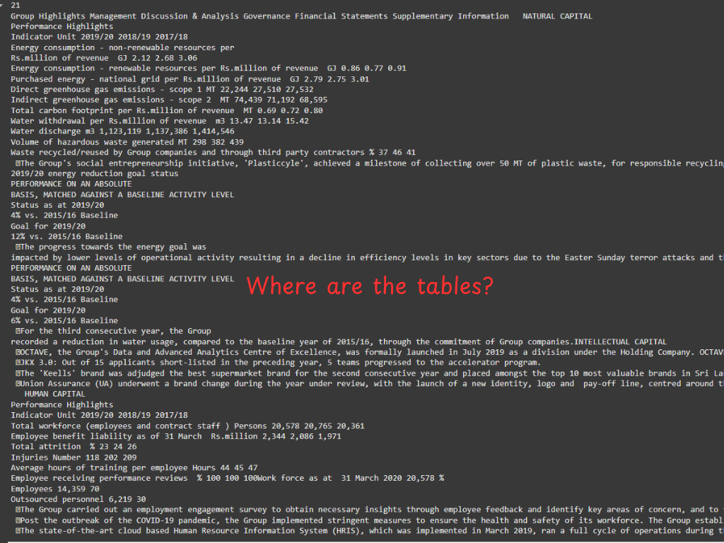 我们所有工作的第一步是将PDF数据转换成文本。然而,年度报告是复杂的文件。不会仅仅有文本。还有图和表等等。每一部分都提供了关于公司的关键信息。