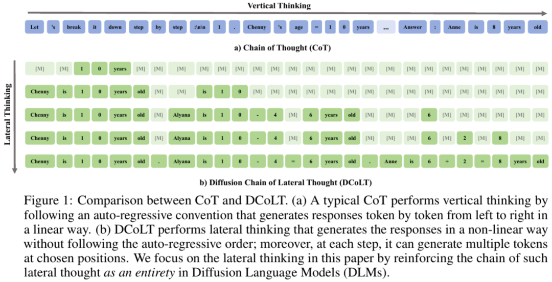 在这一过程中,为了得到最终的输出 x_N,模型天然需要生成一系列中间结果 x_1:N-1。这一过程与「思维链」(Chain-of-Thought, CoT)技术相似。然而,与 CoT 采用线性因果推理不同,扩散过程中的模型能够在思考过程中自由地生成任何有助于达到正确答案的中间内容,更符合发散思维的概念 —— 即通过间接、具有探索性的方法解决问题。正因如此,团队将由去噪过程中所有的中间结果组成的序列称为扩散式「发散思维链」(Diffusion Chain of Lateral Thoughts, DCoLT),并通过强化学习算法优化模型的这些中间扩散「推理」过程。