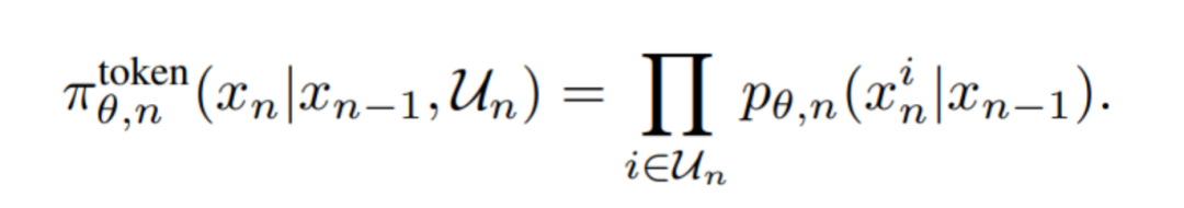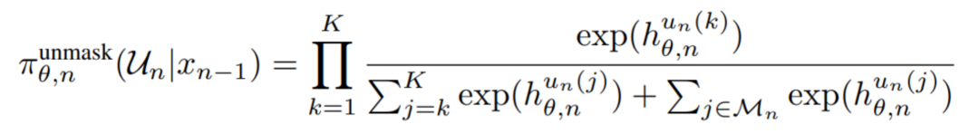 令表示第 n 步之后仍然保持掩码的 token 集合,即满足:。那么,采样得到某个特定的去掩码列表的概率可由下式计算所得。