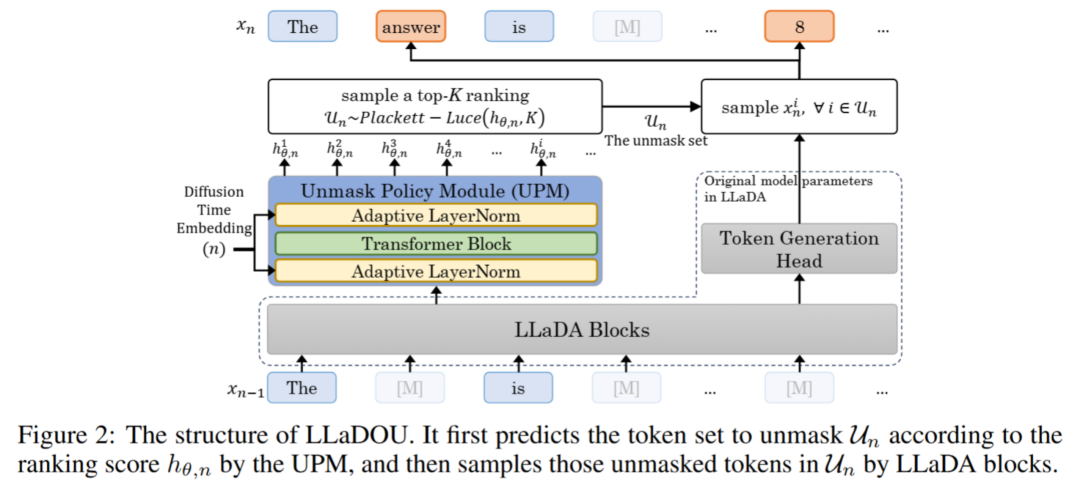 具体而言,在第 n 步去噪过程中,UPM 会取 LLaDA 中最后一层的输出特征作为模块输入,为每一个 token i 预测一个得分。UPM 仅包含一层 transformer,因此对模型计算量影响很小。此外,考虑到当前的去噪步数 n 和每个 token 的掩码状态同样也对去掩码策略十分重要,团队将这些信息作为自适应归一化层编码在 UPM 模块中。为简单起见,团队将经 DCoLT 训练后,包含 UPM 的整个扩散语言模型记为 LLaDOU(LLaDA with Ordered Unmasking)。整体模型结构如下图所示:
