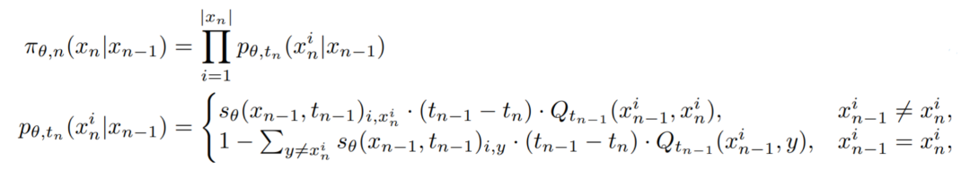 在经典的离散扩散模型 SEDD 模型中,SEDD 模型通过预测,来表示各个 token 的转移概率。因此,团队可以将公式中的替换为模型估计的,从而确定转移概率。