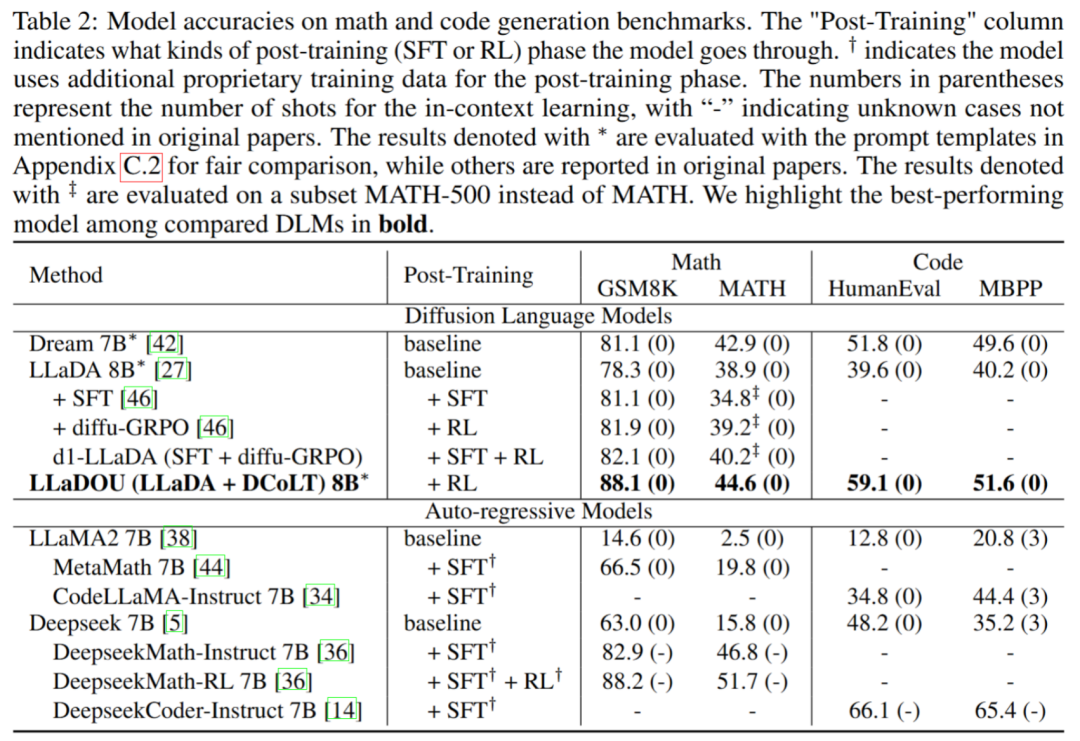 扩散式「发散思维链」目前已成功应用于两种具有代表性的扩散语言模型中。在连续时间扩散语言模型中,该方法可以直接优化由模型输出的得分函数所确定的策略分布;而在离散时间扩散语言模型中,团队将预测不同掩码 Token 的顺序当作模型决策的一部分,并基于 Plackett-Luce 模型设计去掩码策略。据此,团队成功训练有序掩码生成扩散语言模型(Large Language Diffusion with Ordered Unmasking, LLaDOU)。实验表明,仅用公开数据集和 16 张 H800,经扩散式「发散思维链」增强后的模型即可在数学推理和代码生成任务上超越现有扩散语言模型。