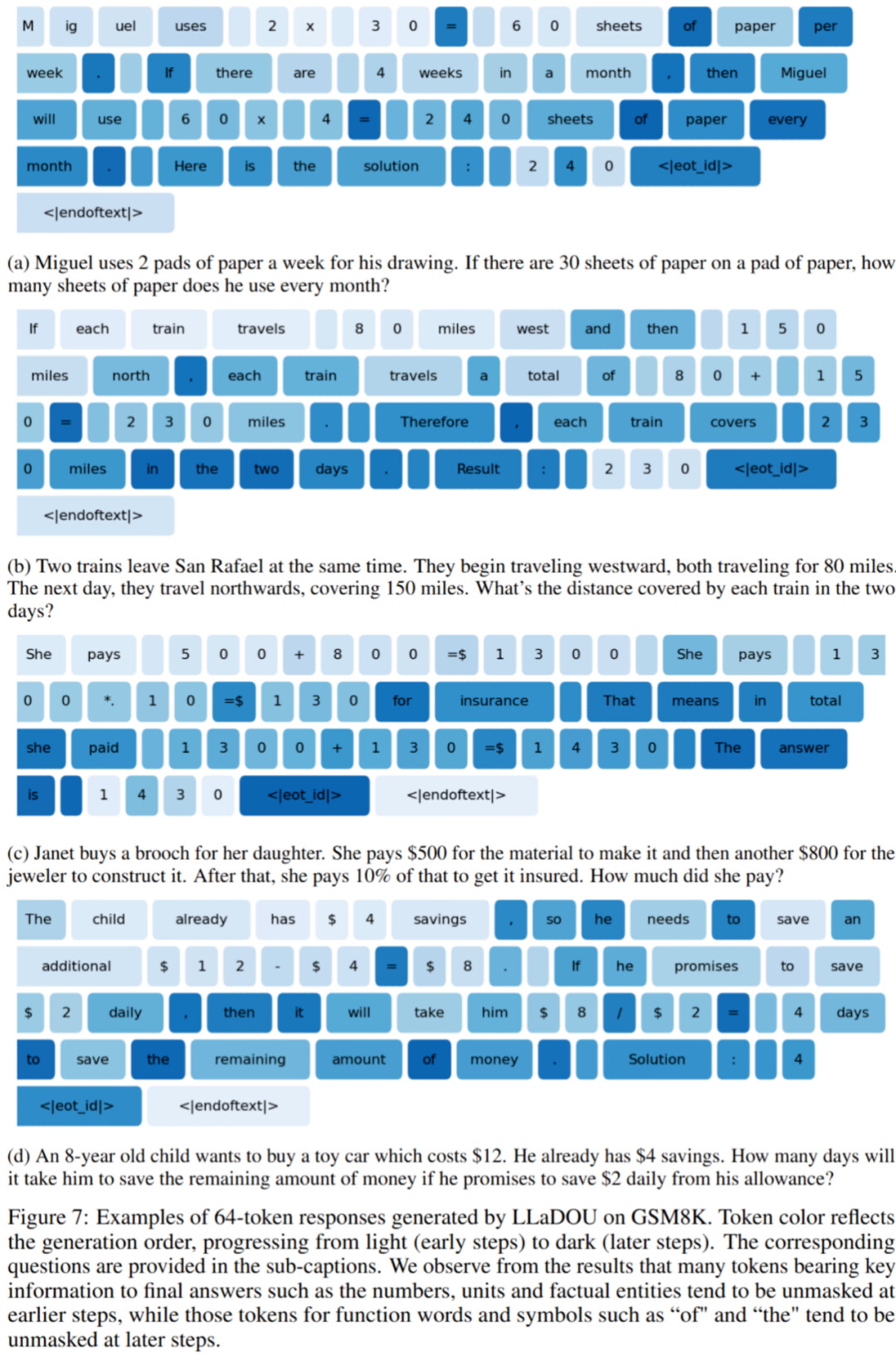 在下图中,团队用不同颜色展示了同一回答中不同 token 的先后生成顺序 —— 越浅的颜色代表 token 在更早的步数生成。可以看出,整个推理过程倾向于首先生成关键数字和计算符号,然后填充其他相关的文本内容,逐渐满足语法约束。