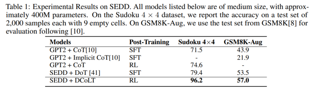首先,团队基于 SEDD 模型,在数独解题和数学推理两个任务上与其他方法展开了公平对比。DCoLT 取得了比 CoT 和 DoT 更好的实验结果。比如在 GSM8K-Aug 数据集上,同样是使用 SEDD 模型,DCoLT 取得了 57.0% 准确率,超越了 DoT,即使后者使用的训练数据中带有逐步骤的详细 CoT 标注。