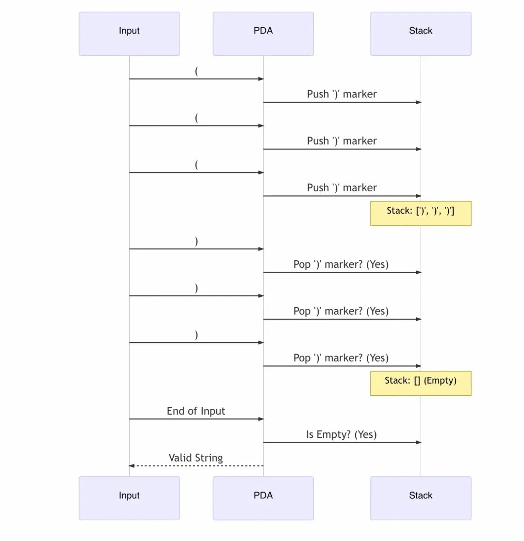 PDA 通过动态地使用栈来跟踪嵌套层级(规则的递归调用 S ::= "(" S ")"),而不是为每种可能的嵌套深度(无限的中间状态)创建单独的状态。这就是它高效处理 CFG 的关键:用有限的状态 + 一个动态的栈,优雅地解决了无限状态空间的问题。