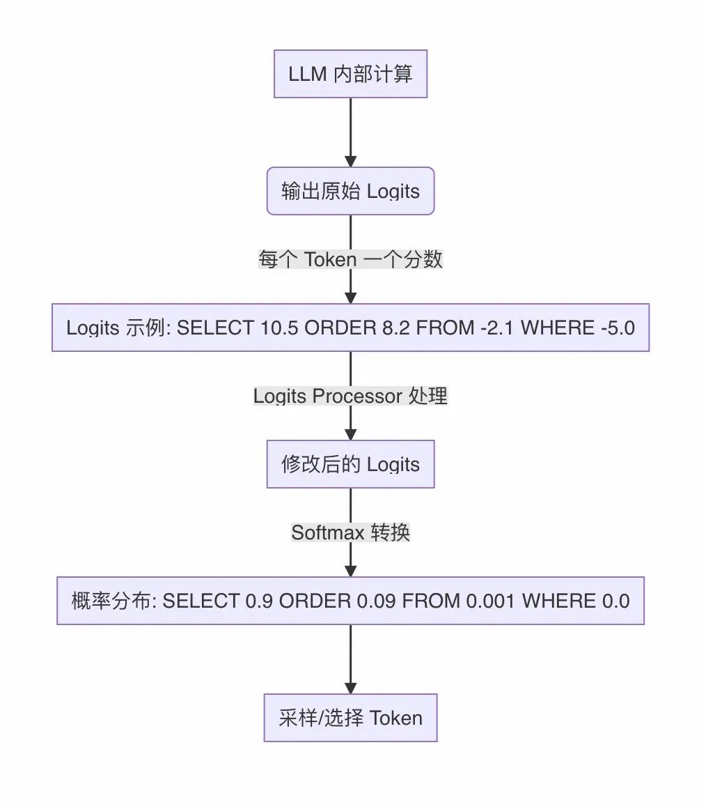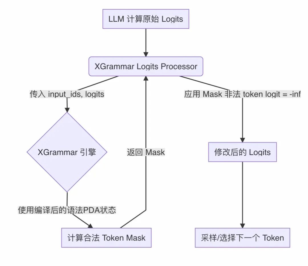 4.Hugging Face Logits Processor: 一个标准的接口,用于在 LLM 的每个解码步骤中修改 token 的概率分布 (logits)。我们将 XGrammar 的约束逻辑封装在此处理器中,实现对生成过程的实时干预。