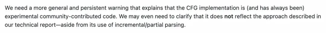Outlines是目前广泛使用的开源框架,它支持多种约束方式,包括正则表达式、JSON Schema 以及 CFG。对于 CFG,它通常依赖如Lark这样的外部解析库,理论上可以支持 LALR(1) 等解析算法。然而,在实践中,为了处理 LLM tokenization 和增量生成带来的复杂性,其由社区贡献的CFG 实现可能面临性能挑战,尤其是在处理复杂或大规模语法时,就算目前的实现是仅使用第一个有效token,其性能也无法接受。同时,官方也强调了这只是一个实验性功能,见pull#1067[3](在我实验中测试,sql的cfg解析时间达到了平均0.12s/token)